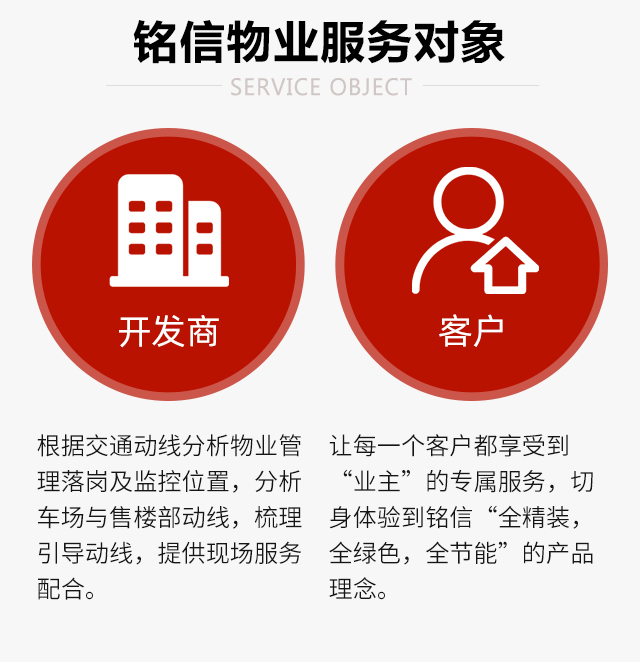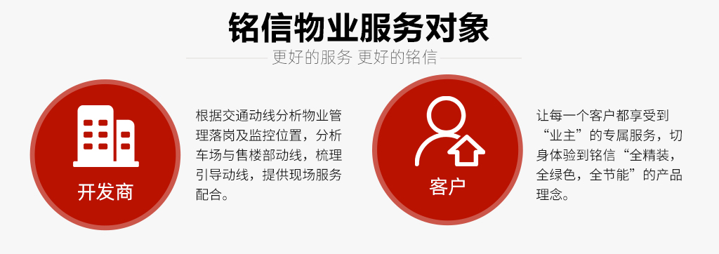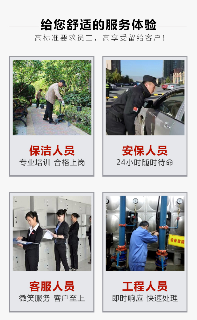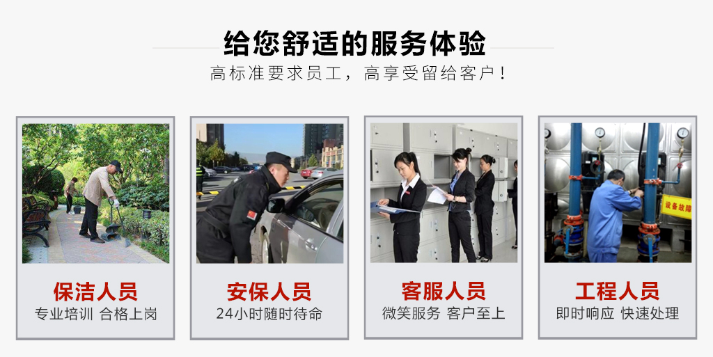 公司坚持“一切为了业主满意”的服务宗旨,致力于创建“善”与“美”的空间,全力营造“安全、整洁、方便、舒适、典雅”的生活及办公环境。